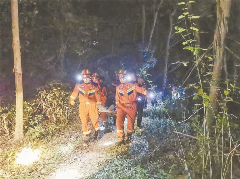 消防救援人员根据报警人的指引,立即携带救生担架、救生绳、腰带、砍刀和扩音器等救援设备进入山林寻找。经过半小时搜寻,救援人员和村民成功在一处落差8米多的山坡下找到浑身是血的陈某宗。