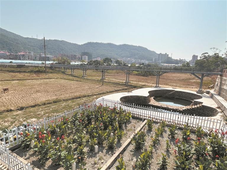 昨日上午,记者来到松仔尾自然村爱心铁桥。站在蜿蜒的铁桥上,俯瞰80多亩农田,视野开阔,微风沁人心脾。桥的这一头有观光台、在建的灯光球场、研学基地、古大厝等,另一头是梅溪流域堤岸。桥下的农田即将种油菜花,机耕路纵横交错,几只耕牛在悠哉地吃草。观光台下方还有两个蓄水池和种着美人蕉的小花园。“过去,这些古大厝长期闲置、脏乱,农田荒废多年,周边杂草丛生。”梅溪村党委书记孙连法介绍建设爱心铁桥的缘由——连通松仔尾古大厝和梅溪流域堤岸,吸引更多人来古大厝。