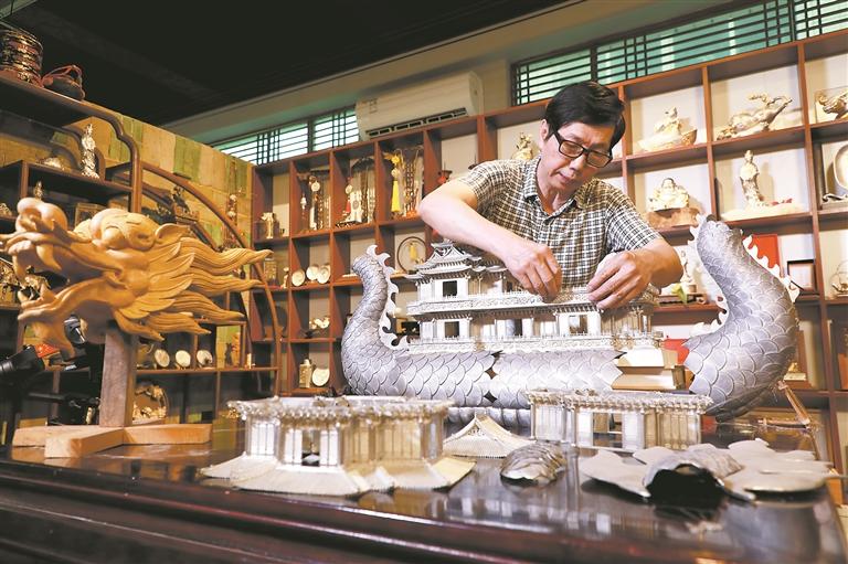 “连发锡铺”的历史可以追溯至1853年,是有据可查的泉州最为古老的一家锡铺,也是泉州打锡街历史上众多锡铺仅存的最后一家,见证着泉州锡雕技艺上百年的传承。杨峰峪从艺五十余年,技艺精臻,声名远播海内外。 □本报记者陈智勇