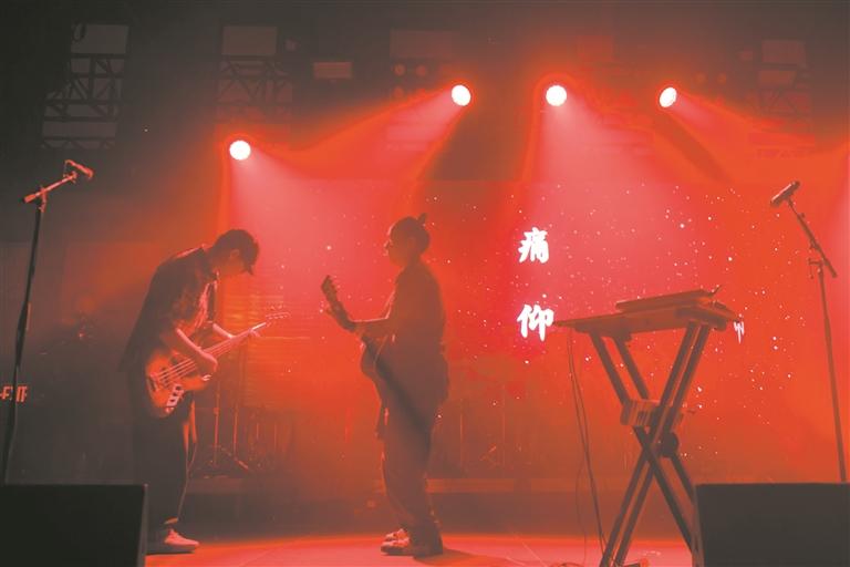 2023年“有朋自东方来”音乐节首站25日落地美国纽约。“有朋自东方来”音乐节持续两天,万能青年旅店、痛仰、房东的猫三支乐队26日晚在纽约继续这股东方音乐的热潮。图为11月26日晚,痛仰乐队在美国纽约举行的“有朋自东方来”音乐节上表演。