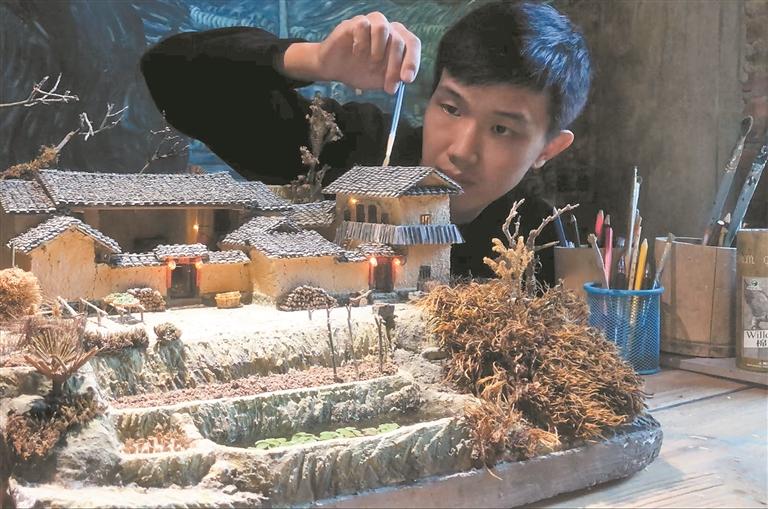 可推开的木制门、鳞次栉比的黑瓦片、斑驳的土坯墙、墙壁边的柴火垛、簸箕上的农作物、门口悬挂的红灯笼……眼前这一栩栩如生、惟妙惟肖的微雕作品《老屋》出自安溪“90后”民间手艺人詹建宁之手。三年前,为留住心中的乡愁,他开始了微雕创作,先后复原了记忆中家乡的老屋、母校等建筑,逼真的作品瞬间勾起了不少同龄人的回忆。近日,记者见到了詹建宁,了解他创作背后的故事。