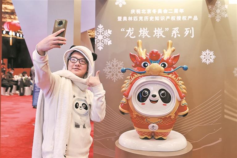 11月29日,庆祝北京冬奥会两周年暨奥林匹克历史知识产权授权产品:冰墩墩龙年新春特别版——“龙墩墩”系列新品在北京国家体育场(鸟巢)发布亮相。图为北京的奥运收藏爱好者张文全与“龙墩墩”自拍合影。 (中新)