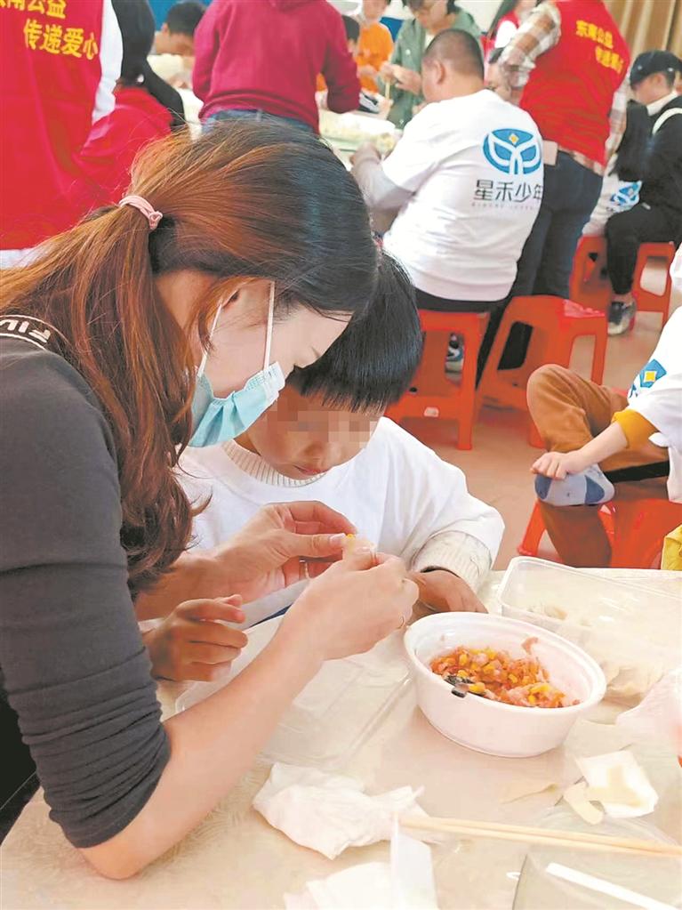 不仅有有趣好玩的游戏,活动现场还有亲子包水饺的生活技能比拼。志愿者将事先分装好的饺子皮和馅料摆放在桌上,五组家庭一桌进行现场比拼。家长们一边认真耐心地教孩子们包水饺,一边还与其他家长进行交流分享。