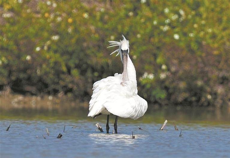 “从今年观测记录的情况看,水头外线湿地记录到14只黑脸琵鹭,数量达到高峰。”吴轲朝介绍说,去年泉州湾水头外线湿地互花米草全面清除后,迁徙候鸟的觅食区、停歇区扩大了,今年来此停歇、中转、越冬的候鸟数量也明显增加。石狮湿地公园是泉州湾河口湿地鸟类的“后花园”,在海水高潮或大风天气期间,包括黑脸琵鹭在内的大量候鸟飞到这里停歇觅食。