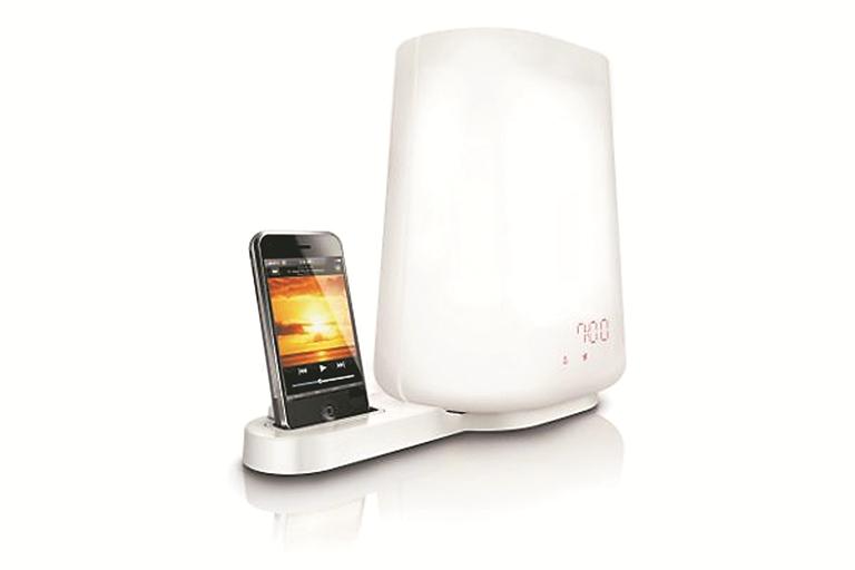 这款闹钟灯最大的亮点就是当闹钟响起的时候,可以在房间内模拟太阳升起的情景,让你在床上就能“观赏”到日出的整个过程。同时,还有一个可放置手机的插槽,在灯光缓缓亮起的时候,能通过手机或者内置的FM收音机播放音乐或者广播节目。