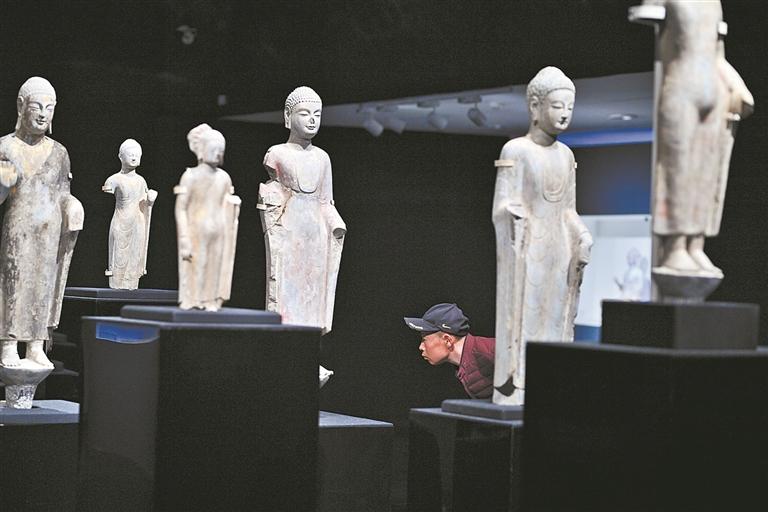 “禮运东方:山东古代文明精粹”特展近日在位于北京市的清华大学艺术博物馆开幕。“禮运”二字典出《禮记》,“禮运”的核心是“大道之行,天下为公”,反映了儒家的核心政治思想和历史观点,对历代政治与文化都有深刻影响。图为参观者在观看北齐时期佛造像。 (新华)