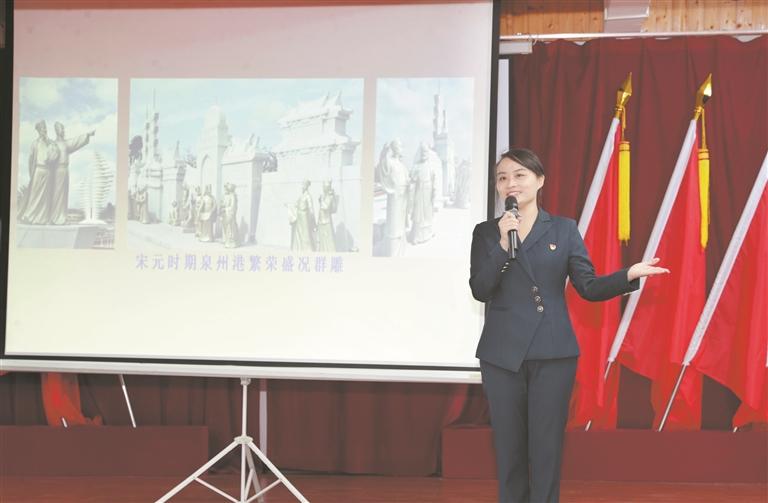 泉州华侨革命历史博物馆办公室主任刘丽红则讲述了祖籍地在泉州南安的开国上将叶飞将军的生动故事,让听众感受到什么是不计得失、无私奉献。“中流击水,奋楫者进,我们要有‘虽千万人,吾往矣’的豪情。”刘丽红借叶飞将军的故事,激励现场听众要以奋斗之我在拼搏中担负时代重任,在奋斗中牢记历史使命,不断砥砺前行。