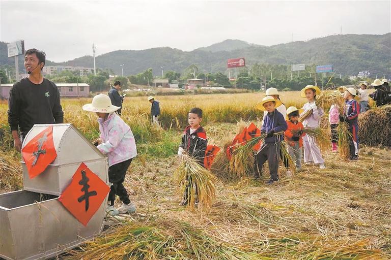 秋季是丰收的季节,农耕研学抓住这一契机在南安悄然兴起。中小学生们在家长的带领下,化身小农夫,与稻谷、镰刀打交道,钻进甘蔗林亲手收获甘甜。组织者还开堂授课《讲解水稻的一生》、诵读《耕读敬天地赋》等,讲授农耕知识、收获技巧,传递农耕文化。图为南安市文体旅集团、坤坤农场在南安市莲塘城市田园综合体联合举办“农耕研学课堂·小小农夫割稻记”,让孩子们在劳动中感受收获的喜悦。(黄耿煌 陈坤坤 摄)