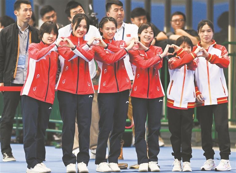 冠军组合陈芋汐(左三)/全红婵(左四),亚军组合掌敏洁(左二)/张家齐(左一)和季军组合李蕊汐(右一)/卢为在现场向观众致意。(新华)