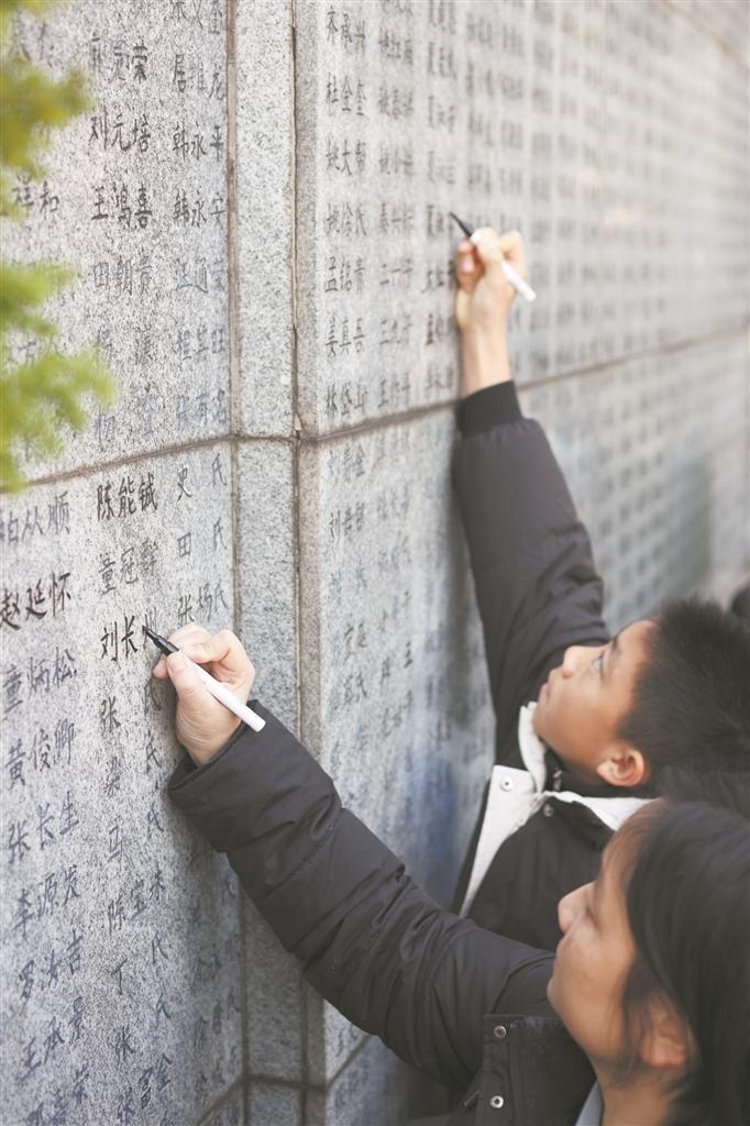 ?12月3日,侵华日军南京大屠杀遇难同胞纪念馆在“哭墙”(南京大屠杀遇难同胞名单墙)前举行南京大屠杀死难者家庭祭告,参加活动的南京大屠杀遇难同胞遗属代表、学生代表为遇难同胞名单墙上的名字描新。 (中新)