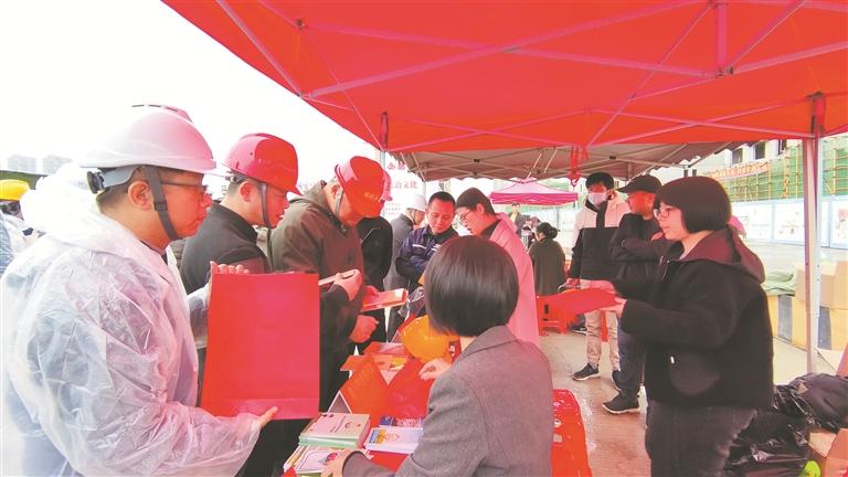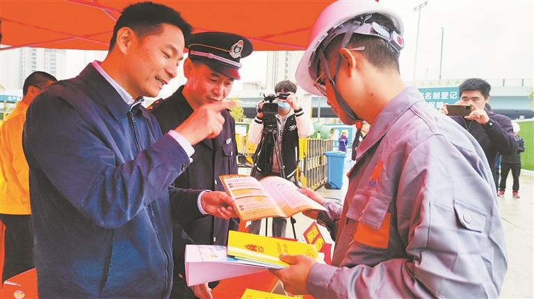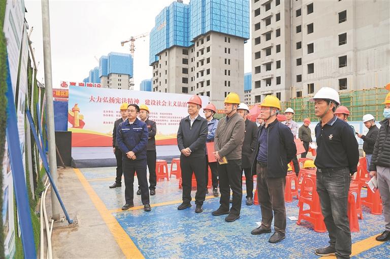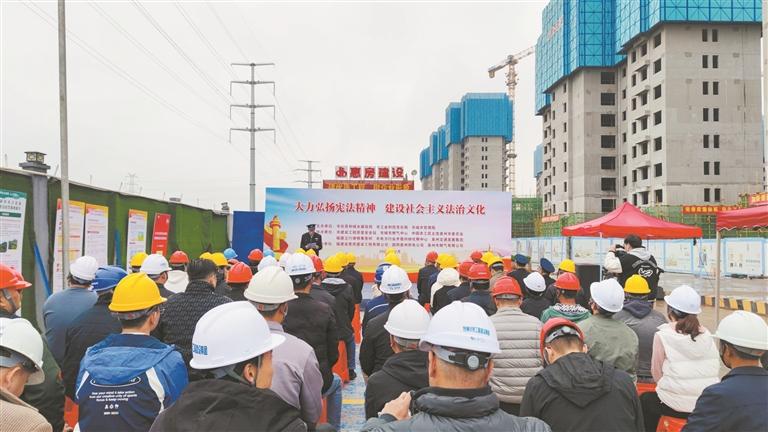 12月4日,是我国第十个国家宪法日。为深入学习宣传贯彻习近平法治思想和全面依法治国新理念新思想新战略,大力弘扬宪法精神和社会主义法治精神,营造我市施工法治环境,推动宪法宣传教育形成热潮,一场以“大力弘扬宪法精神,建设社会主义法治文化”为主题的宪法宣传日活动,昨日在城东至北峰快速通道及两侧片区棚户区改造项目——东星安置房01地块施工项目部开展。