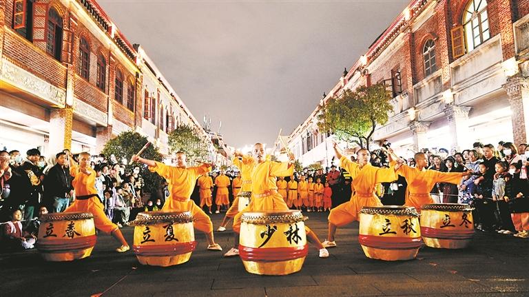 12月1日晚上7点,夜幕之下的中山中路一片喜庆,“锦鲤瓦市·Wa是锦鲤”中山路非遗国潮市集活动火热开场,南少林武术、泉州刣狮、火鼎公婆、街舞等节目依次亮相,非遗市集互动体验感满满,精彩活动燃爆古城,引来市民游客欢呼声、掌声不断。(吴秋瑜 摄)