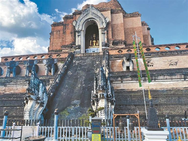在清迈府会厅前,我们见到了三尊雕像。据导游介绍,这是清迈兰纳王朝时期的曼格莱王和素可泰的蓝坎亨王、帕尧的南蒙王,他们情同兄弟,互结友好条约,1296年,曼格莱王在其他两王的大力协助下建成了清迈城。它一度成为泰国政治、经济、文化中心,被誉为“泰北玫瑰”。这里的魏功甘古城遗址200多年前被洪水淹没,在1984年才重新被发现。我们还乘着当地特有的嘟嘟车(三轮摩托车)绕着清迈古城跑了一圈。