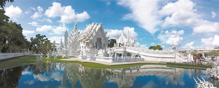 当我们走近白庙,映入眼帘的是让人心旌颤抖的白。不同于其他金碧辉煌的泰国寺庙,这儿的建筑设计大胆,采用纯白的色调,真的是别具一格。白庙的设计师是华裔,中文名叫许龙才,祖籍广东汕头,在他42岁(1997年)的时候,自费出资重建白庙,他带领一批跟他学画的学生,历时22年,建成了这座美轮美奂、享誉海内外的著名寺庙。除了白庙,清迈的黑庙与蓝庙也颇有独到之处。