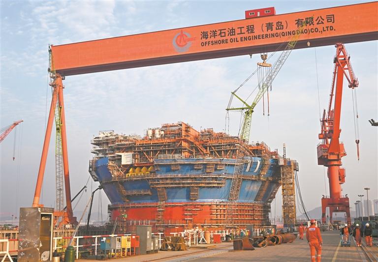 近日,由我国自主设计建造的亚洲首艘圆筒型“海上油气加工厂”——“海洋石油122”浮式生产储卸油装置(FPSO),在青岛进入最后的总装集成冲刺阶段。据介绍,“海洋石油122”船体直径约90米,设计排水量10万吨,可连续海上作业15年不回坞。 (新华)