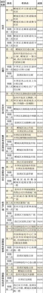 10月份,市城管局考评中心共抽评63个社区、82条主次干道、110个住宅小区、26个街旁广场、53条内沟河、6条江岸带、34座市场、84座公厕、55条道路绿化、215个二次供水单位、12座公园、3个城建PPP项目,共发现问题7408处。各区综合考评成绩如下:洛江区84.38分,泉州开发区84.18分,鲤城区83.45分,泉港区82.70分,丰泽区82.42分。