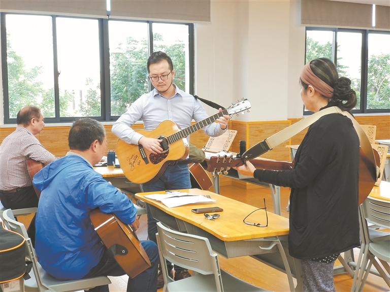 “希望将来我自己的晚年生活也能调节到一个理想的状态,老了也可以像他们一样多姿多彩。”落日余晖洒进教室,优美的吉他和弦,配上轻快的曲调,林明忍抱着吉他和自己的学员们慢慢哼唱:“暖阳下,我迎芬芳,是谁家的姑娘,我走在了那座小桥上,你抚琴奏忧伤……”