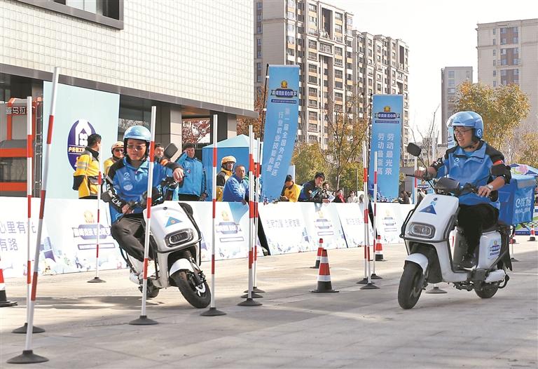12月7日,首届全国外卖配送行业职业技能竞赛在沪举行。全国外卖配送行业主要品牌的配送员在行车技术规范、取餐送餐流程以及与商家和顾客的沟通技巧等方面展开比拼,提升技能水平,促进外卖配送行业规范化、专业化发展。图为两名配送员在比赛中进行电瓶车绕桩骑行。 (新华)