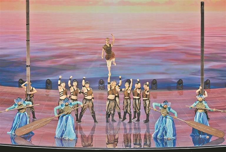任凭大浪滔天,勇者一往无前。合唱与杂技《乘风破浪》开始,舞台背景变成一艘风浪中摇曳的大船,杂技演员在狭窄的长杆上跳跃翻转,犹如海上行船时,忍受风浪颠簸的精妙技艺。优质的产品,正是通过一艘艘航船传播到世界各地。