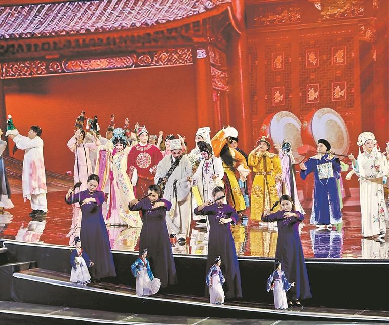 以演员扮演的明代思想家、文学家李贽为引子,串联起生旦净丑,戏曲《古韵新腔荟刺桐》主题是“人生如戏 戏如人生”。一段段唱词或铿锵有力,或婉转低回:“宋元明清,勾栏正唱刺桐城,争奇斗艳,欣闻盛世庆太平”“‘南海明珠’, 铿锵高甲称奇”“千年刺桐百戏生,喜悲善恶演不停”……