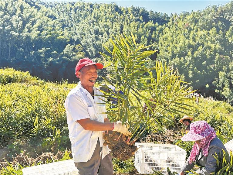 近年来,永春县桂洋镇岐山村按照“产业兴旺、生态宜居、富裕和谐”的发展思路,建立“党小组+合作社+农户”机制,大力发展生姜产业,带领村民种植生姜,有力促进村民增收致富。图为近日村民在采收生姜。(林艺华 摄)