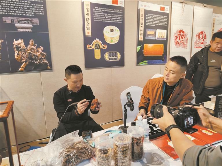 展览中,非遗传承人也通过直播介绍起丰富的非遗展品。“我们现在来到泉州展区,展示德化瓷烧制技艺、惠安石雕、闽南传统民居营造技艺、木偶头雕刻(江加走木偶头雕刻)、泉州木雕、水密隔舱(福船制造技艺)、乌龙茶制作技艺(铁观音制作技艺)、永春漆篮制作技艺。”来自莆田的非遗传承人黄建海此次带来了国家级非遗项目莆田木雕。除现场展示外,他还通过直播向广大网友介绍木雕技艺及参展的其他非遗项目。