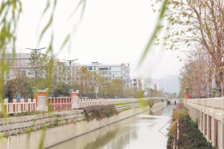 昨日上午10点多,记者来到市区繁荣大道的繁荣渠(笋江—内环路)段,只见渠岸旁黄花风铃木、柳树随风摇曳,宽阔的渠道内波光粼粼,流水干净无味,搭配上具有闽南特色的防护栏,渠道与道路有机衔接,景观风格协调统一,俨然一幅生动和谐的城市风景画。据悉,繁荣渠(笋江—内环路)段位于金龙街道、浮桥街道,全长3.6公里,渠道净宽12米,深约6米。此前,由于繁荣旧渠周边有居民生活污水直接排入,垃圾和淤泥累积导致渠道长期不流通,不仅对周边生态环境造成严重破坏,也影响居民的生活质量。