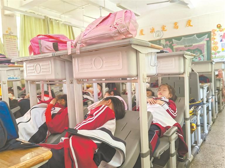 挪动课桌、调整座椅、躺下休息,仅需几个步骤,学生便能在教室里躺着午休。自“双减”政策实施以来,我市不少中小学陆续推广午托服务,并因地制宜为学生创造午休条件。其中,“午休神器”——新式午休课桌椅的配备让部分学生实现从“趴睡”变“躺睡”。那么,“躺睡”让学生的睡眠质量提高了吗?舒适“躺睡”的推广存在哪些难点?又该如何破解?连日来,记者进行了走访调查。□本报记者 魏晓芳 郭芳蓉 文/图