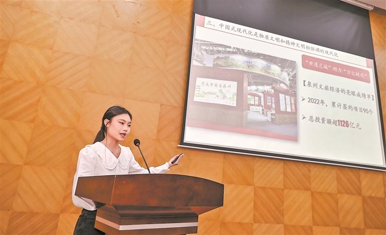 紧随其后,来自黎明职业大学青苗理论宣讲团的廖馨颖以《于“万亿时代”的“世遗之城”》为题,娓娓讲述泉州在调和物质富足和精神富足上的种种做法,引出“中国式现代化是物质文明和精神文明相协调的现代化”这一理论,只有不断厚植现代化的物质基础,大力发展社会主义先进文化,传承中华文明,才能达到物的全面丰富和人的全面发展相统一。