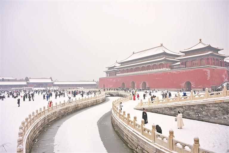 北京市气象台于12日夜间将暴雪预警信号升级为“橙色”等级,中小学、幼儿园居家学习等七条响应措施发布。目前,北京已启动暴雪、寒潮、道路结冰预警。图为12月13日,游客在雪中游览故宫。(新华)