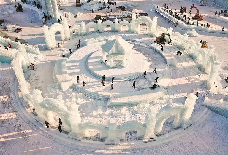 以“龙腾冰雪 逐梦亚冬”为主题的第二十五届哈尔滨冰雪大世界将于12月18日开园迎客。目前在园区内,林立的塔吊、穿梭的机械交织成一首忙碌的建设“交响曲”。本届哈尔滨冰雪大世界将使用25万立方米的冰和雪,倾力打造一个梦幻精彩的冰雪童话世界。图为12月14日,工人在哈尔滨冰雪大世界园区建设现场施工(无人机照片)。