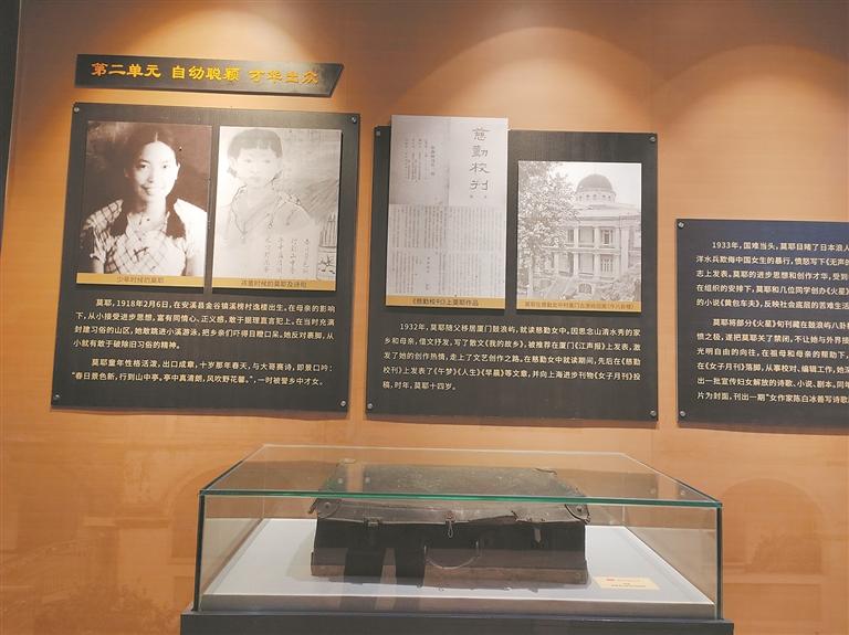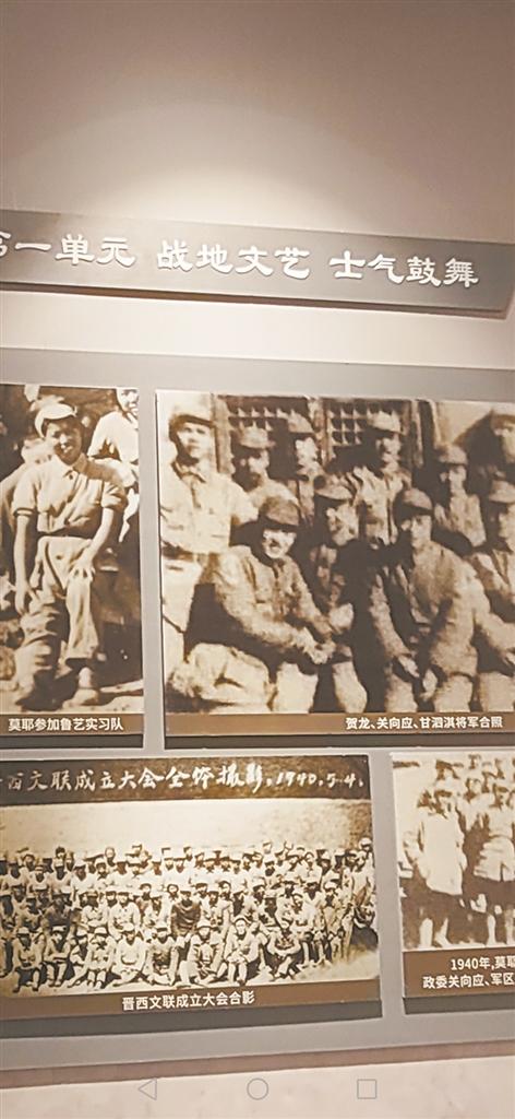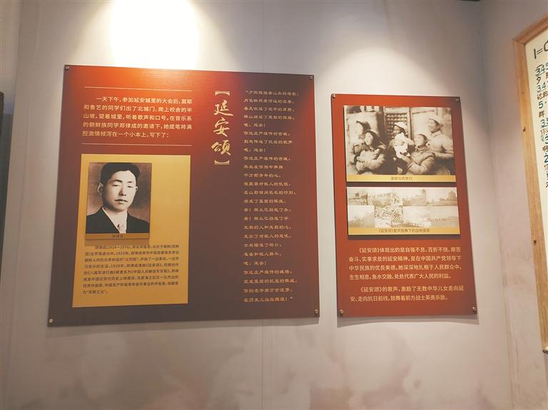 阁楼里的柱梁椽桷、门窗桌椅全上了朱红大漆,头上红瓦,脚下红砖,写就一宅红色的庄严。踏上阁楼木梯,“吱嘎,吱嘎”的声音令人一下回到以往的时光。或许是童年陈淑媛和哥哥陈文章准备赛诗,或许是返乡的莫耶忙着准备和嫂子们去村里宣扬抗战精神,又或许是哥哥赶着去联络进步青年加入“抗战青年团”。再过来的展馆,用一幅幅红色的图文如影视般展播着莫耶各个时期的活动。从童年的敢于据理直言破旧俗,到青年时的以笔为枪激情抗战……玻璃展柜里,一册册作品文集记录着烽火的故事。珍贵的莫耶文稿虽已泛黄,但隽秀的笔迹和跃动的灵感还是那么飘逸。从窑洞捎回的《延安颂》歌纸,依然飘着延安的油墨香。