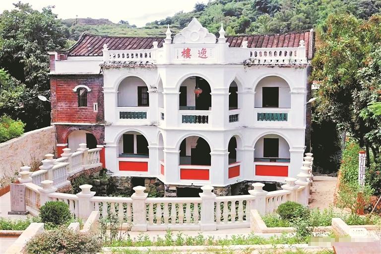 也许是主人出过洋的缘由,这幢两层阁楼的建筑便有了中西合璧的风格,个性甚是彰显。外观有着古罗马建筑的线条,又蕴藏着闽南红砖古厝的韵律。外墙以白色与红色为主,并有节奏地搭配着绿色,别致的情调令人回味,楼前池塘也颇为雅丽。楼面顶额是晚清泉州进士曾振仲题写的“逸楼”红字,在辉阳中甚是耀眼。