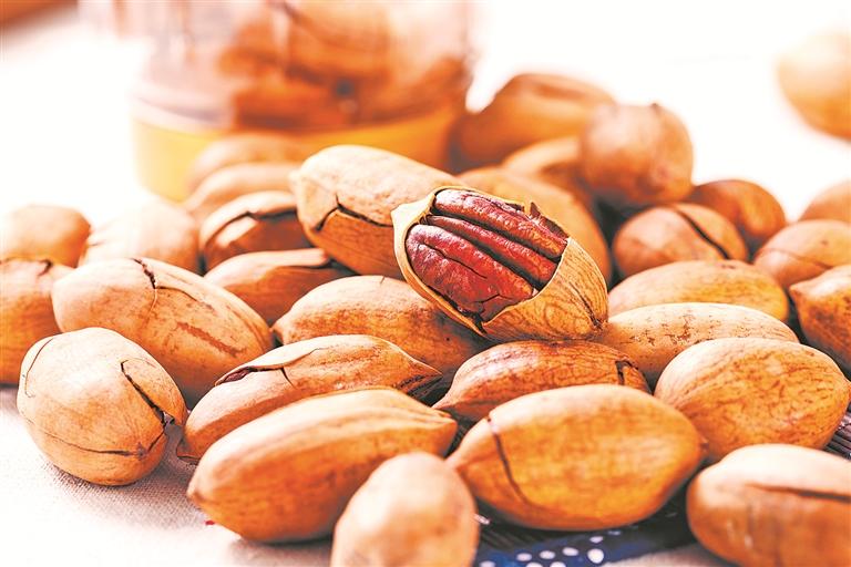 碧根果含多种营养,如蛋白质、脂肪、纤维素、胡萝卜素、维生素E以及钙、钾、镁等人体所需的多种微量元素。其内含丰富的纤维素及健康的脂肪,食用后会带来一定的饱腹感,有降低食欲的作用,有助于控制体重。同时,纤维素也有利于人体消化系统的正常运作,可以辅助预防便秘。它脂肪含量较高,对于体形消瘦的人来说,食用后有增胖的效果。碧根果中也含有丰富的维生素E,平时适量吃一些,不仅能改善皮肤粗糙、萎黄的状况,起到润泽、光滑皮肤的作用,使皮肤保持弹性,有头发早白困扰的人,日常吃些碧根果,也有乌发、润发等作用。此外,食用富含单不饱和脂肪酸的碧根果,能帮助肠道减少对胆固醇的吸收,促进血液的净化,有助防止动脉硬化。感到疲劳时,吃些碧根果能起到缓解疲劳、舒缓压力的效果。需要提醒注意的是,碧根果中含有的油脂较多,吃多了容易导致上火,因此有上火、腹泻症状的人,要少食或不食碧根果。