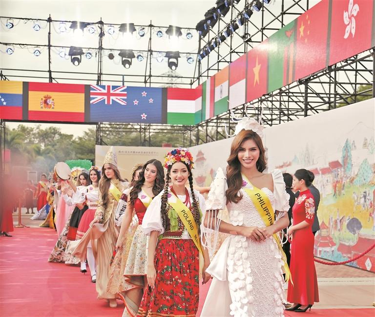 “我爱泉州!泉州欢迎您!”下午2时,来自世界各国的旅游小姐冠军齐聚南音艺苑,欣赏提线木偶、梨园戏、南音,进行品茶等活动,然后搭乘公交“小白”,开启了独具特色的踩街巡城之旅。下午4时,各国佳丽到达中国闽台缘博物馆文化广场,随后,她们身着盛装,牵着蟳埔簪花服饰打扮的小朋友们步入红毯区,向全球发出邀约,寄送明信片并签署代言签名,向世界展现中国泉州的美丽风光和文化魅力。