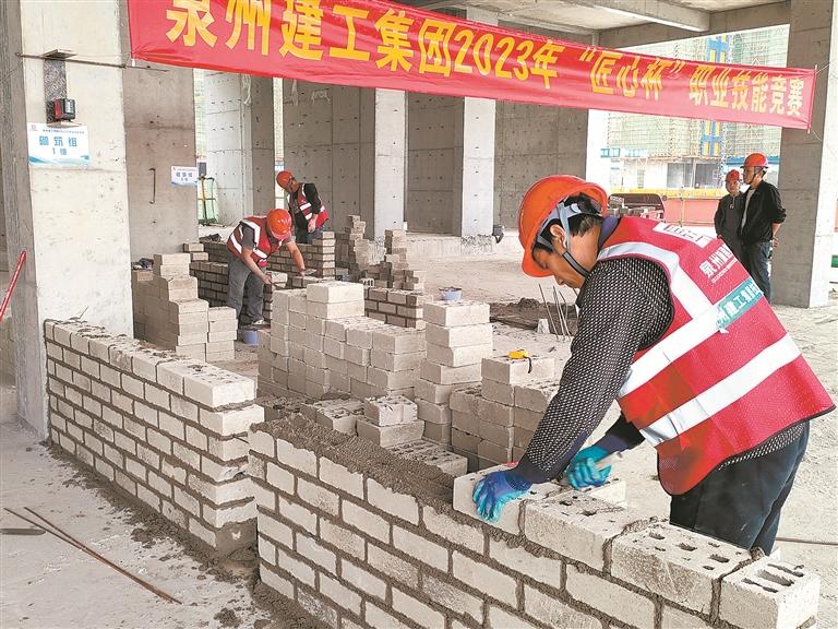 这是发生在2023年泉州建工集团“匠心杯”职业技能竞赛上的一幕。本次竞赛于12月13日至14日举办,由泉州城建集团统筹指导,设工程测量、钢筋检验技能、模板拼装和砌筑施工等4个项目。比赛精心设计流程,严格规则,并邀请黎明职业大学土木建筑工程学院专业老师、教授加入评委组,来自泉州建工集团20个项目部的94名选手参赛。
