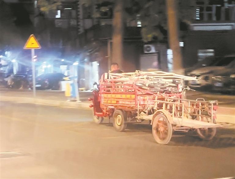 ▲丰泽区坪山路泉州市农业学校附近,一辆三轮摩托车后面用绳子绑了一辆三轮自行车,就这样拖行了一路,存在安全隐患。(刘女士 摄)