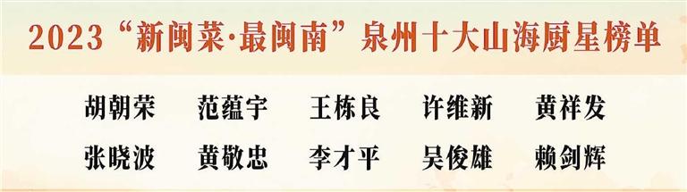 以美食之名,当晚7时许,“新闽菜·最闽南”美食系列推选颁奖典礼隆重举行,为系列活动画上圆满句号。颁奖典礼上,当天决出的泉州十大山海厨星、泉州新锐厨星、泉州美食名菜、泉州创意名菜、泉州名小吃、泉州人气小吃6个奖项,以及此前已完成评审工作的优秀组织奖项目、泉州美食名店项目、人气名店项目、“厝边的味道”2023美食微视频大赛获奖者,纷纷在现场得到表彰。