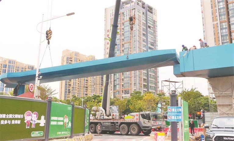 本报讯 (记者高慧子 通讯员郭晓玲 文/图)昨日,在洛江区万智街和安吉路交叉路口,一座横跨安吉路两侧的人行天桥已初见雏形。施工现场,工作人员正在进行主体结构焊接作业,两辆吊车正将梯道钢箱涵缓缓升起。