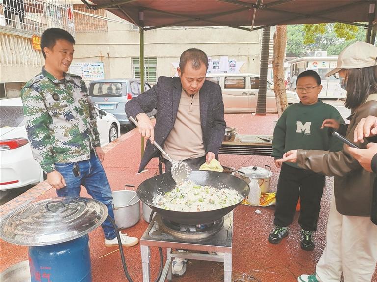 小眉村常务副主任石加奕则搭起特地从小眉村运来的柴火灶,现场演示煮柴火饭的过程,在慢火焖烹中吊足了居民们的胃口。芥菜饭的香气诱人,尚未煮熟,现场便排起长龙。“煮熟了!”不到十分钟,一锅芥菜饭便被分享得锅底朝天。石加奕赶忙又烧了一锅,“今天共煮10公斤米的芥菜饭,让大家免费尝一尝。”到了中午,猪肉、蔬菜全部售罄。“明天还来卖吗?”不少市民询问道。“12月30日再来,以后每两周来一次。”石俊明笑着答道。