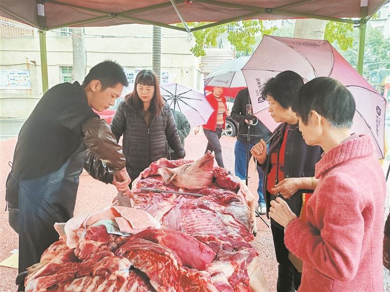 “出发!”16日早晨7点多,小眉村下着雨,雾气蒙蒙,村党总支书记石俊明带队4辆货车,前往泉淮社区。临近9点,一行来到社造广场,泉淮社区党委书记林志忍和居委会工作人员马上上前帮忙卸货。现场搭起了帐篷,各色农产品摆放到桌子上。蔬菜区有芥菜、包菜、白萝卜、佛手瓜等,农副产品区有地瓜干、地瓜粉、蜂蜜等。石师傅将自家养殖的现宰土猪肉摆放到案台上。