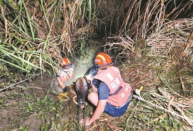 17日19时许,晋江市龙湖镇鲁东村一头牛掉落水潭。接到报警后,龙湖消防救援站立即出动人员前往现场。