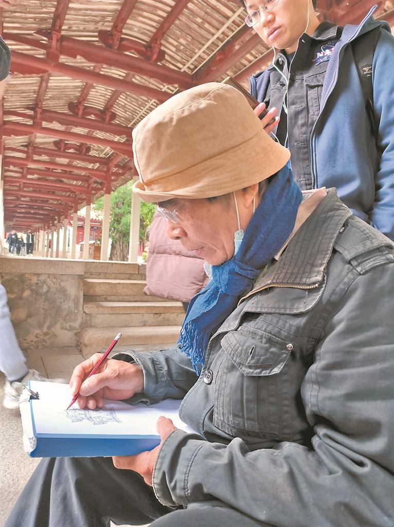 如今在社交平台,时常能看到他低头作画的场景,他俨然成为各地游客镜头里一道独特的风景线。