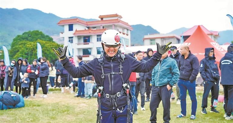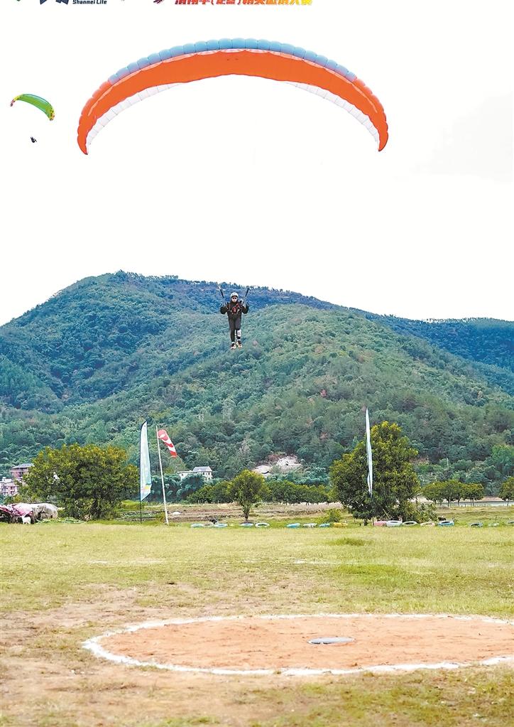 从海拔680米的山顶绿茵坪一跃而下,彩色的滑翔伞一如彩虹划过碧水青山,盘旋,飞翔,而后缓缓降落在美丽的山美水库湖畔定点位置上。日前,南安九都举行2023年“七彩人生”杯滑翔伞(定点)精英邀请赛,来自全国18个省份的共80余名运动员齐聚南安九都参赛。