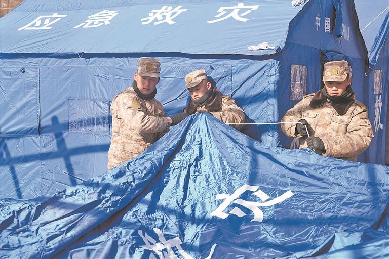 12月21日,陆军第76集团军某旅官兵在积石山县石塬镇为受灾群众搭建帐篷。 (新华)