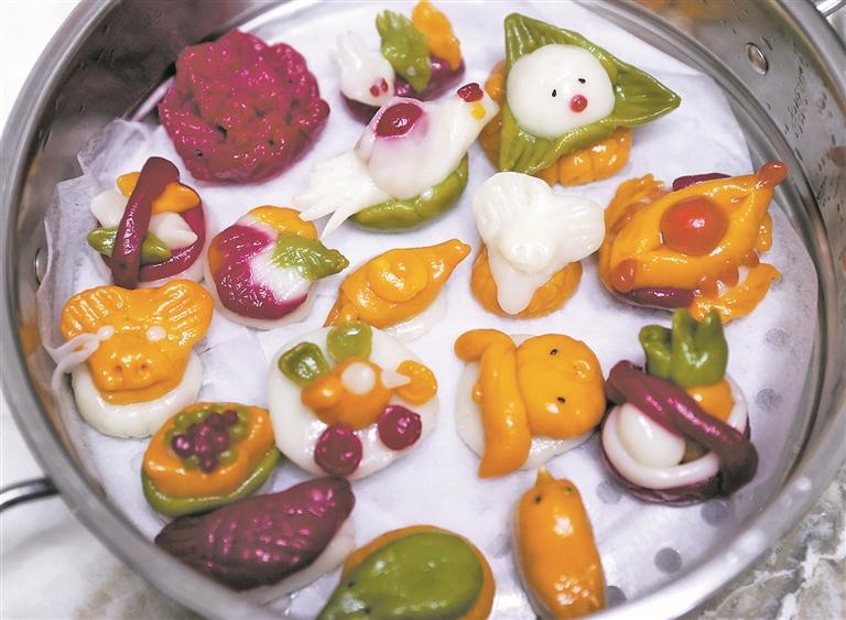 “咱厝人,冬至时,碨米绞粞搓红丸。搓糖粿,无稀奇,捏猪捏狗捏金鱼。”亦如闽南童谣所唱,除了冬至汤圆之外,黄阿实介绍说,泉州人过冬至所食的特色糯米点心,样式其实并不单一。譬如,依照传统食俗,用来搓“冬节圆”的糯米团子,可以拿来做皮,包裹入冬笋、香菇、猪肉等食材为馅制成菜包。或是可以将这些糯米团子拿来捏成一些如小巧玲珑的瓜果、金锭银宝等形状以及鸡、狗、猪、羊、兔、鱼等动物样子,这个做法在泉州民间也有一个专属俗名为“做鸡母狗仔”。这些隐含有冬至过后的日子能够“一帆风顺、吉祥如意”等意思的糯米点心,不仅会被拿来作为祭祖拜神的贡品,也被人们视为冬至的应节“吉祥物”,可以用于传递美好的节日祝福。相较于“冬节圆”多为红白两色,“鸡母狗仔”的颜色会更为缤纷多彩,包括有白、红、黄、绿等各种颜色,待蒸熟后盛盘上桌,远观近看都很漂亮。另外,廖榕光还补充说,在泉州不同地区,也可以寻到多种以糯米为主材的冬至时令小食。以南安为例,如用糯米、猪油、芝麻、花生仁、冰糖等手工制作而成的英都麻糍,或是用糯米团子拌佐花生碎,以及用红糖、金橘、陈皮、香蕉油、花生油调制的酱汁来制成的诗山糖粿,都是南安地区人们过冬至时会吃的食物。另外在永春地区,每逢冬至到来,为抗寒做准备,当地人则会用糯米与红粬进行搭配来酿酒,以作驱寒之用。不仅如此,廖榕光补充说,与清明节的食俗有着相似之处,那就是在冬至这一天,一些泉州本地人们的餐桌上,还会出现有润饼菜的身影,谈及缘由,他认为,这是与寓意于食的传统做法有关,人们会借由润饼菜所蕴含的“包金包银”之意,在冬至亲朋欢聚的时候,以这道传统食物去祝福彼此能够财源广进,祈愿在冬至过后的日子依旧过得称心如意、顺遂安康。