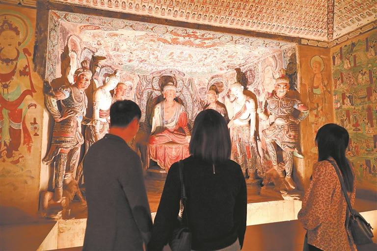 近日,“丝路光华——敦煌石窟艺术特展”在台湾高雄佛光山佛陀纪念馆开幕,展出复制洞窟2座,中心塔柱1座,文物、临本、数字化复制品、多媒体影片等共120余件(套)。图为民众观展。(陈小愿 摄)