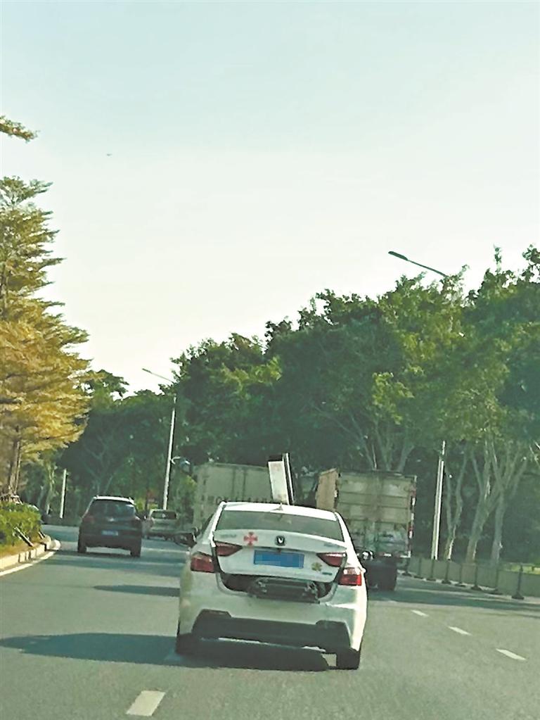 ?在泉州市区江滨北路滨江花园城附近路段,一辆小车在天窗和后备厢各放置了一些铁架,并伸出了车外,实在危险。