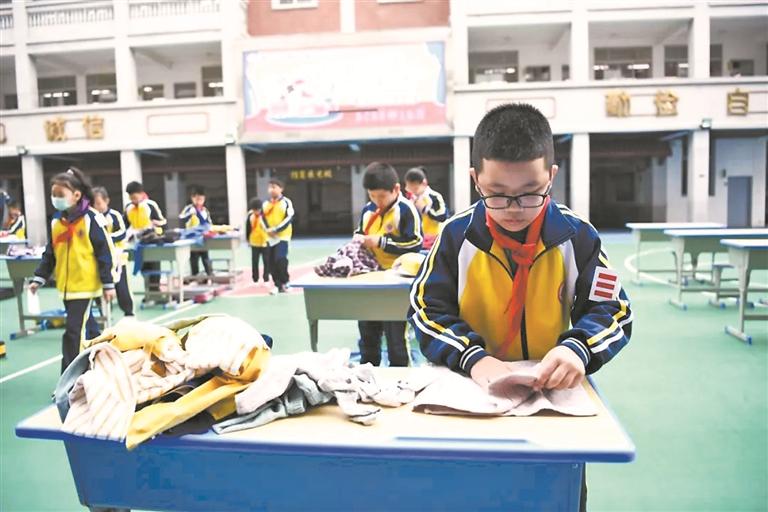 此次比赛中,该校根据不同年龄阶段特点,分设了多种多样的劳动比赛项目。如一年级学生比拼整理书包的技能,二年级的比赛项目是系红领巾、穿鞋带,而三年级至六年级的学生们比拼了整理行李箱的技能,五六年级的学生们则切磋了厨艺技能。