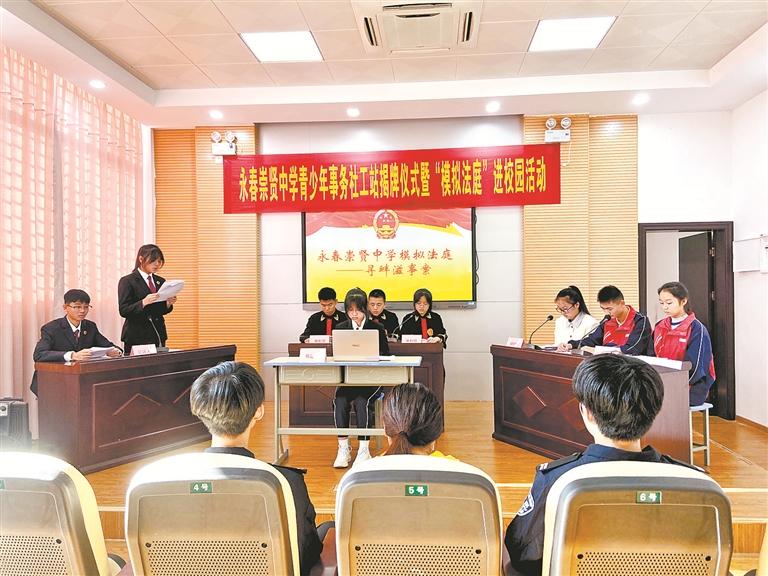 日前,永春县崇贤中学举行“青少年事务社工站”成立揭牌仪式暨“模拟法庭”进校园活动。该社工站是永春县成立的首家学校社工站,将促进家庭、学校、社会三方联动,共同探索“学校引导—社工助力—家校合作”的多元互动、多方合作、多向协调的协同育人机制,为青少年创建良好的学习和成长环境,为未成年人的健康成长保驾护航。